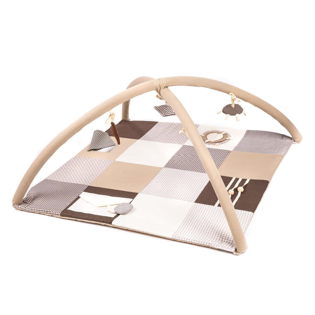 • Interactive elements on the mat edges: squeaky toy pocket, wooden buttons, crinkling shapes, and baby mirror