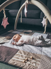 A handmade activity mat designed to give babies a safe and stimulating place to explore the world from day one. Created together with a children’s physiotherapist, the mat supports early development through sensory play, textures, sounds, and movement. The calm Nordic color palette looks great in modern homes while still giving babies the visual contrast they need for early development.