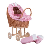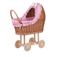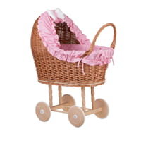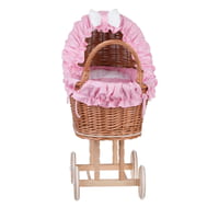 Lulu wicker doll stroller with pink trim, blanket, and pillow