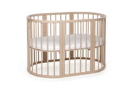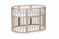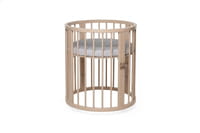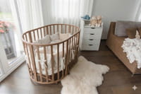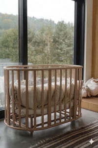 Round Baby Crib OLIN is a solid beechwood baby crib designed to grow with your child from newborn stage up to around 5 years. It features three mattress base heights, a fully removable side, and lockable wheels, making it easy to use as a classic crib, bedside crib, or open daybed. Made from natural beech wood and finished with non toxic water based varnish, it is built for safe everyday use and long term durability.