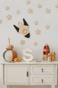 Perfect for young explorers fascinated by planets, rockets, and the mysteries of the cosmos, this set features a painted rocket, Saturn, moon, and 10 stars (5 small, 5 large). The stars are natural and unpainted, adding a touch of authenticity to your space-themed decor. Crafted from high-quality birch plywood, each piece is meticulously painted using child-safe acrylic paints with certified safety standards.