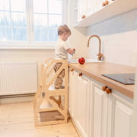 Every tower is carefully crafted in Europe from birch plywood, chosen for its strength, light weight, and natural beauty. Each surface is coated with eco-friendly, water-based varnish — completely safe for children and free of harsh chemicals. Rounded corners and a stable structure ensure lasting safety and comfort for your little explorer.